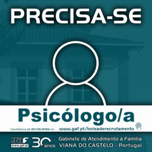 Recrutamento/seleção Psicólogo/a Informamos que está a decorrer um processo de recrutamento e seleção para um/a Psicólogo/a (para projeto para estrutura de atendimento na área da violência doméstica) do GAF - Gabinete de Atendimento à Família.