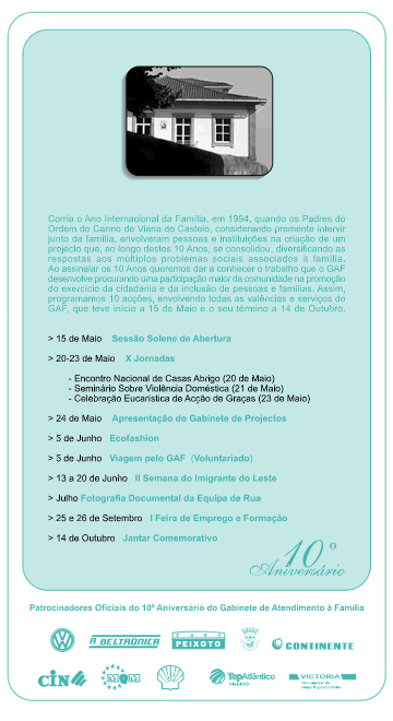 No dia 15 de Maio, Dia Internacional da Família, no Salão Nobre do Governo Civil de Viana do Castelo, com a presença das autoridades e forças vivas da cidade e de outras localidades onde o GAF tem um papel interventivo, realizou-se a Sessão Solene de Abertura das Celebrações do 10º Aniversário do GAF.