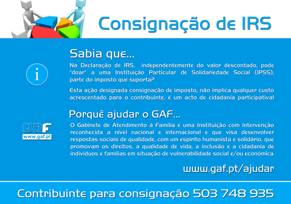 SABIA QUE... Na Declaração de IRS, independentemente do valor descontado, pode "doar" a uma Instituição Particulares de Solidariedade Social (IPSS), parte do imposto que suporta? Esta ação designada consignação de imposto, não implica qualquer custo acrescentado para o contribuinte, é um acto de cidadania participativa! PORQUÊ AJUDAR O GAF... O Gabinete de Atendimento à Família é uma Instit[...]