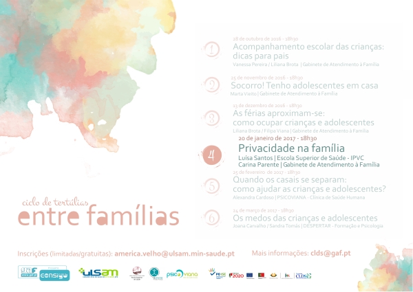 Ainda não se juntou a nós no grupo de “Tertúlias Entre Famílias?” A edição número 4, dedicada ao tema Privacidade na Família vai decorrer no dia 20 de janeiro, pelas 18:30 nas instalações da ULSAM – Unidade Local de Saúde do Alto Minho. As inscrições são gratuitas, mas limitadas às vagas existentes. Faça já a sua para o email america.velho@ulsam.min-saude.pt O Ciclo de Tertúlias Entre [...]