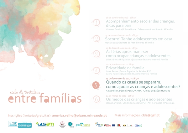 Na próxima tertúlia, que se realiza no dia 24 de fevereiro, contamos com a colaboração da Psicoviana na dinamização da sessão! A conversa vai girar em torno da separação dos casais e do seu impacto nas crianças e adolescentes. Contamos consigo? Inscrições gratuitas, mas necessárias, em america.velho@ulsam.min-saude.pt O Ciclo de Tertúlias Entre Famílias resulta de uma parceria entre CLDS-3G do Gab[...]