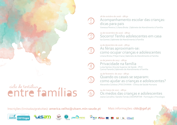 A Equipa CLDS-3G Viana Consigo, do Gabinete de Atendimento à FamÃlia, e o Serviço de Pedopsiquiatria da ULSAM - Unidade Local de Saúde do Alto Minho convidam a participar no Ciclo de Tertúlias Entre FamÃlias, que, dirigido a pais, mães e outros/as cuidadores/as, pretende debater e desfazer ideias pré-concebidas acerca da parentalidade e, ao mesmo tempo, desafiar as/os participantes a construir, em conjunto,[...]