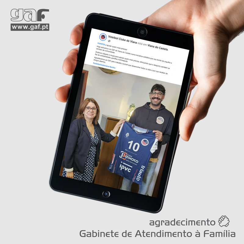O GAF – Gabinete de Atendimento à Família agradece ao Voleibol Clube Viana pelo donativo em espécie e com a responsabilidade social pelo bem-estar da comunidade vianense que demonstraram.