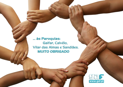 O GAF torna público, por este meio, o agradecimento especial ao Pároco das Freguesias de Gaifar, Calvêlo, Vilar das Almas e Sandiães do Concelho de Ponte de Lima, Padre Álvaro Correia de Sá, pela sua colaboração e contributo no peditório realizado no passado dia 25 de novembro de 2012 no âmbito do "Dia Internacional para a Eliminação da Violência contra as Mulheres" assim como a todos os paroquianos destas freguesias pelo seu contributo nesta causa. O referido peditório totalizou 620,00 €. Bem hajam a todos!