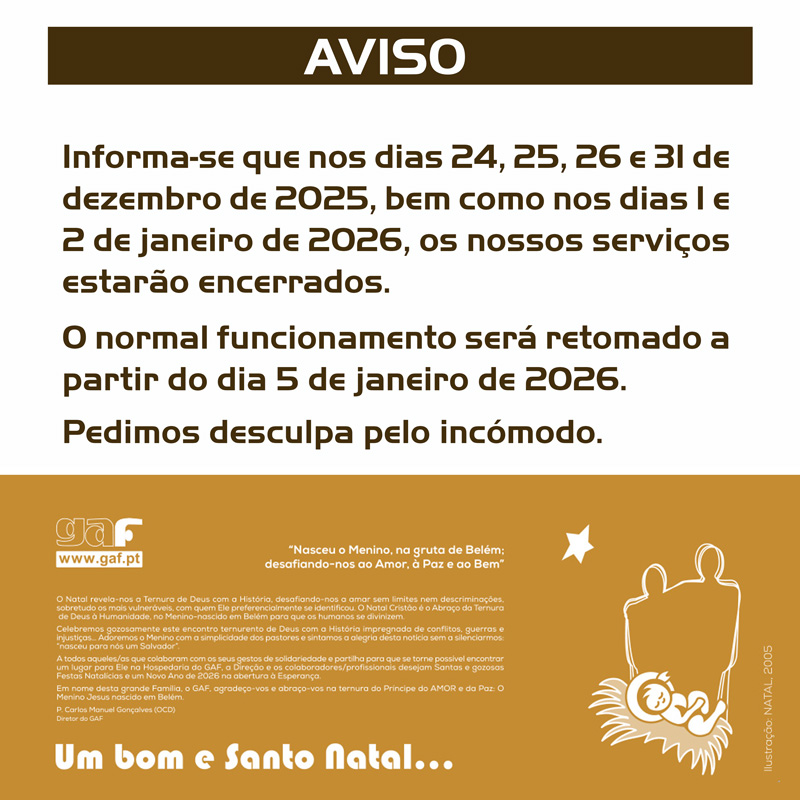 Informa-se que nos dias 24, 25, 26 e 31 de dezembro de 2025, bem como nos dias 1 e 2 de janeiro de 2026, os nossos serviços estarão encerrados. O normal funcionamento será retomado a partir do dia 5 de janeiro de 2026. Pedimos desculpa pelo incómodo.