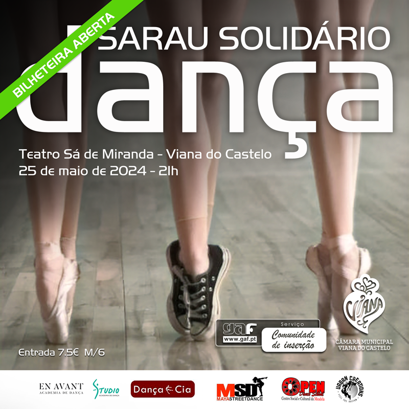 O Sarau Solidário de Dança, , organizado pela Comunidade de Inserção do GAF - Gabinete de Atendimento à Família, estará de volta no dia 25 de Maio pelas 21horas, no Teatro Municipal Sá de Miranda em Viana do Castelo. A receita de bilheteira contribuirá para colmatar algumas das necessidades com que o Serviço Comunidade de Inserção do GAF e os seus utentes se deparam. Esta iniciativa conta com a participação de 6 escolas que prontamente aceitaram o repto que lhes foi lançado: Academia de Dança En Avant , Academia de Dança Studio, Dança e Cia, Maya Street Dance; Open Dance School; e Urban Creations, que, para além da solidariedade que lhes reconhecemos e agradecemos, brindarão os Vianenses com as suas magnificas coreografias.
