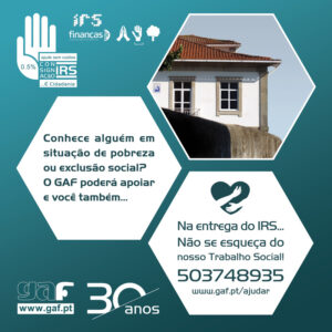 Consigne o seu IRS ao GAF e estará também a apoiar pessoas em situação de pobreza ou exclusão, vitimas de violência doméstica, crianças em risco, pessoas com problemas ligados ao álcool ou dependências, pessoas desempregadas ou em situação de sem abrigo e pessoas portadoras de VIH.