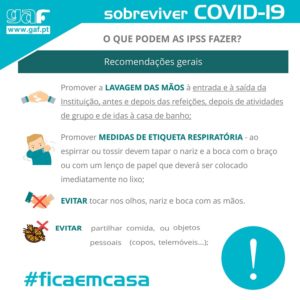 (1) medidas de etiqueta respiratória: tapar o nariz e a boca quando espirrar ou tossir, com um lenço de papel ou com o antebraço, nunca com as mãos, e deitar sempre o lenço de papel no lixo; (2) lavar as mãos frequentemente. Deve lavá-las sempre que se assoar, espirrar, tossir ou após contacto direto com pessoas doentes. Deve lavá-las durante 20 segundos (o tempo que demora a cantar os “Parabéns”) com água e sabão ou com solução à base de álcool a 70%; (3) evitar contacto próximo com pessoas com infeção respiratória; (4) evitar tocar na cara com as mãos; (5) evitar partilhar objetos pessoais ou comida em que tenha tocado.