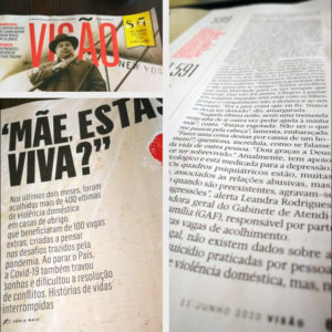 revista VISÃO em mais uma reportagem sobre Violência Doméstica em tempos de pandemia. A mesma, minuciosamente elaborada por Vânia Maia, faz um retrato desta realidade a várias vozes... mulheres vítimas de violência doméstica, técnicos/as de apoio à vítima responsáveis por estruturas de acolhimento e a Secretária de Estado para a Cidadania e Igualdade, Rosa Monteiro.