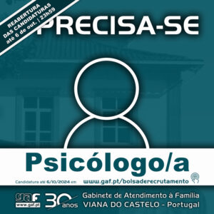 Recrutamento/seleção Psicólogo/a Informamos que está a decorrer um processo de recrutamento e seleção para um/a Psicólogo/a (para projeto para estrutura de atendimento na área da violência doméstica) do GAF - Gabinete de Atendimento à Família.