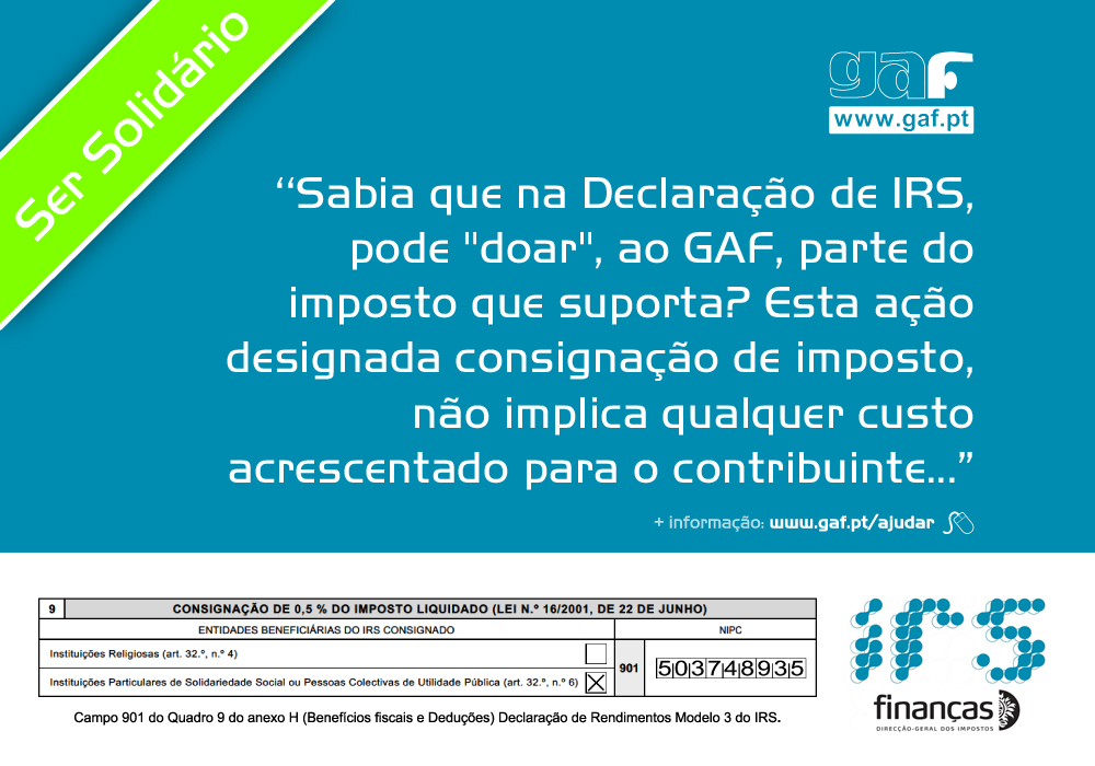 Clique para ver maior. Não se esqueça do GAF na sua declaração de IRS! Ao colocar o nosso número de contribuinte (503 748 935) na sua declaração de IRS, no campo 901 do Quadro 9 do anexo H - Benefícios Fiscais e Deduções da Declaração de Rendimentos, está a apoiar, sem qualquer custo acrescido para si, a intervenção com mais de 1000 famílias em situação de pobreza e exclusão social. Apoie esta[...]