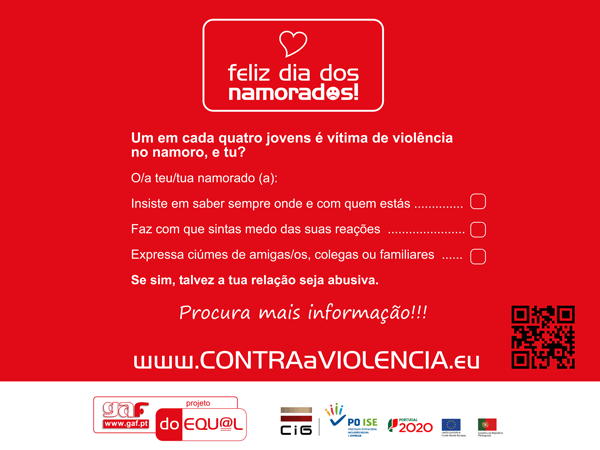 Sabia que, 68,5% dos adolescentes legitimam a violência no namoro, de acordo com um estudo lançado hoje, pela União de Mulheres Alternativa e Resposta (UMAR). O Projeto Doequ@l do Núcleo de Atendimento a Vítimas de Violência Doméstica deseja a todos um feliz Dia dos Namorados, reforçando que uma das suas linhas de atuação visa apoiar os jovens a desenvolverem relacionamentos saudáveis, pautados pela igu[...]