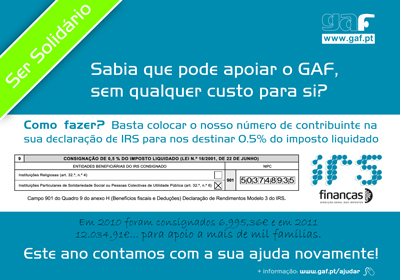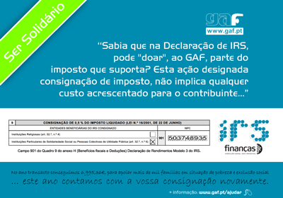Não se esqueça do GAF na sua declaração de IRS! Ao colocar o nosso número de contribuinte (503 748 935) na sua declaração de IRS, no campo 901 do Quadro 9 do anexo H – Benefícios Fiscais e Deduções da Declaração de Rendimentos, está a apoiar, sem qualquer custo acrescido para si, a intervenção com mais de 1000 famílias em situação de pobreza e exclusão social. Apoie esta missão! [...]