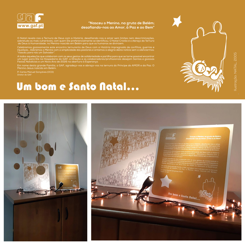A todos aqueles/as que colaboram com os seus gestos de solidariedade e partilha para que se torne possível encontrar um lugar para Ele na Hospedaria do GAF, a Direção e os colaboradores/profissionais desejam Santas e gozosas Festas Natalícias e um Novo Ano de 2026 na abertura à Esperança.