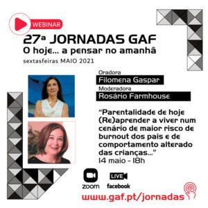 27ª JORNADAS GAF O hoje... a pensar no amanhã sextasfeiras MAIO 2021 Num cenário social, económico e cultural ainda pautado pela incerteza do real impacto da pandemia COVID-19 procurar-se-á refletir sobre de que forma o confinamento em casa, o isolamento social, o encerramento das creches, jardins de infância e escolas associado ao teletrabalho e/ou ao "lay-off" vieram colocar novos desafios à parentalidade. Procurar-se-á compreender os fatores que dificultam ou protegem os pais e as mães a lidarem com o stresse resultante da necessidade de conciliarem múltiplas tarefas (funções parentais habituais, apoio ao ensino escolar em casa, trabalho em casa, aumento das horas despendidas em tarefas domésticas), numa situação de pós-confinamento que é nova e, para muitos pais, acompanhada de grandes desafios financeiros e da antecipação de dificuldades no futuro. De que forma estratégias de parentalidade e coparentalidade positivas (como é exemplo as promovidas no âmbito do Projeto Adélia - CNPDPCJ) podem ser um recurso para diminuir por um lado alterações emocionais e comportamentais das crianças e, por outro, promover o bem-estar emocional e sentido de competência parental.