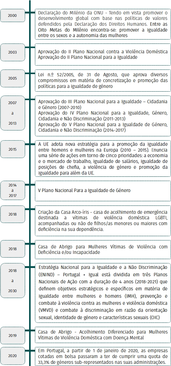 Em 2018, Portugal lançou uma Estratégia Nacional para a Igualdade e a Não Discriminação (ENIND) – Portugal + Igual, apoiando-se em três Planos Nacionais de Ação que definem objetivos estratégicos e específicos em matéria de igualdade entre mulheres e homens (IMH), prevenção e combate à violência contra as mulheres e violência doméstica (VMVD) e combate à discriminação em razão da orientação sexual, identidade de género e características sexuais (OIC).